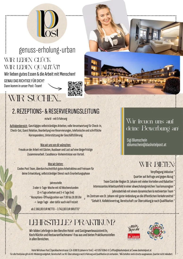 Du suchst eine neue Herausforderung und möchtest in einem außergewöhnlichen Betrieb arbeiten? Dann bist du bei uns im Hotel & Wirtshaus Post in St. Johann in Tirol genau richtig!