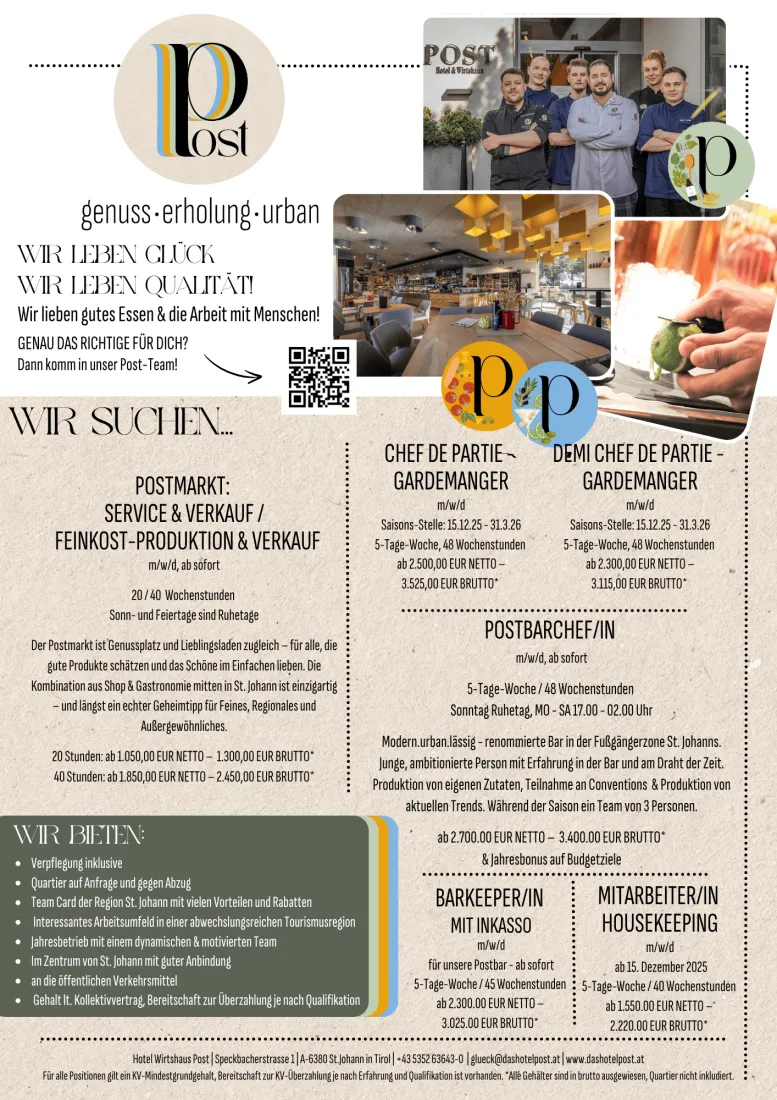 Du suchst eine neue Herausforderung und möchtest in einem außergewöhnlichen Betrieb arbeiten? Dann bist du bei uns im Hotel & Wirtshaus Post in St. Johann in Tirol genau richtig!
