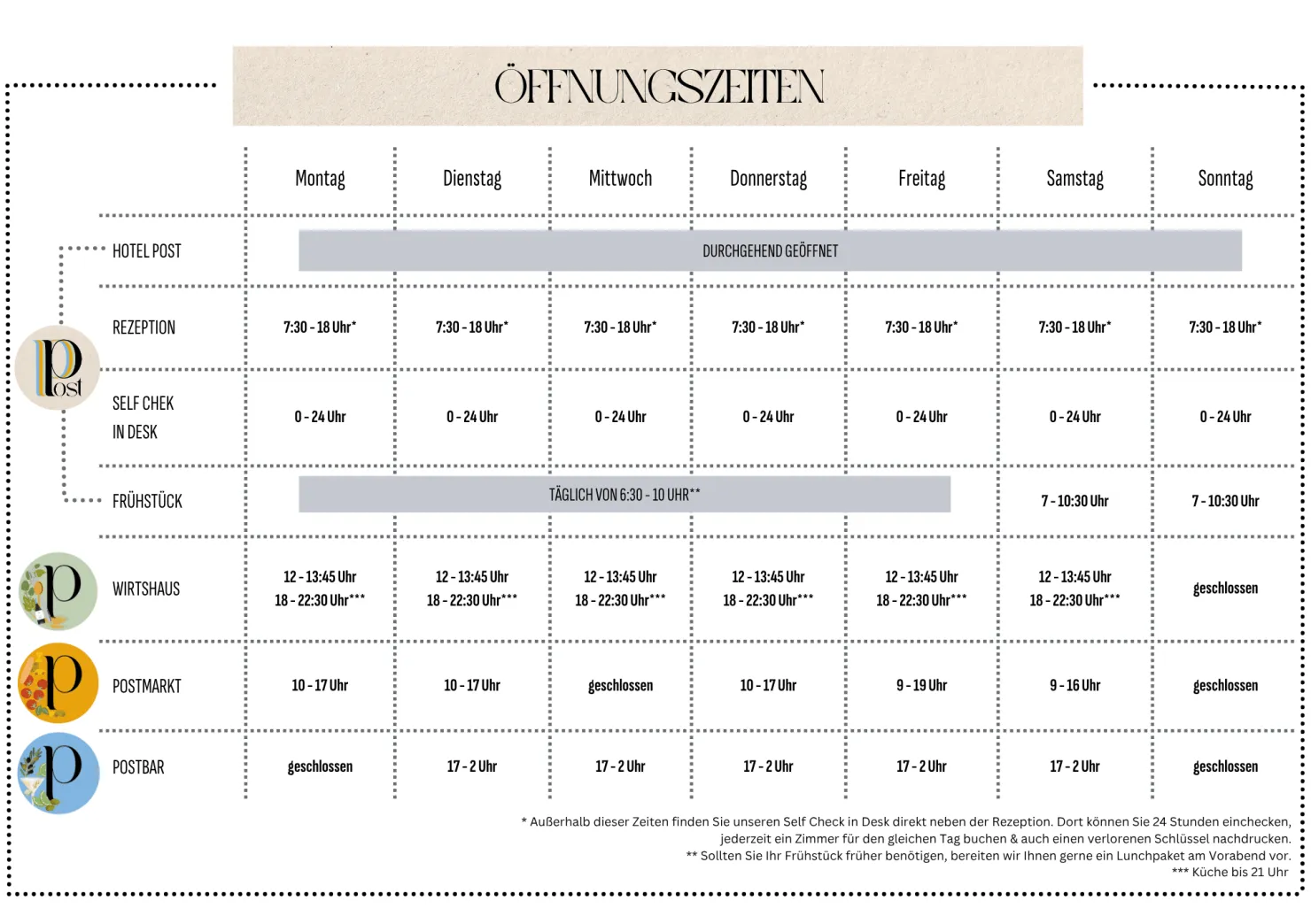 A warm HELLO with us at the Hotel & Wirtshaus Post. We are very pleased that you have chosen our house as your vacation hotel. To make your vacation a wonderful time of rest and relaxation, we have summarized all the important information about your stay in this information sheet. For personal answers you can reach us at the reception under extension 9.