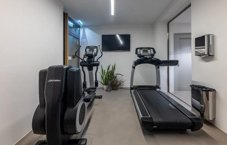 Fitnessraum mit hochwertigen Geräten – Crosstrainer, Laufband, Heimtrainer stehen allen Hotelgästen kostenfrei zur Verfügung